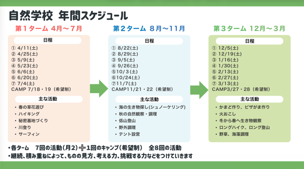 鎌倉近郊の山や海など自然フィールドで8つの原体験をもとに、活動を行います。